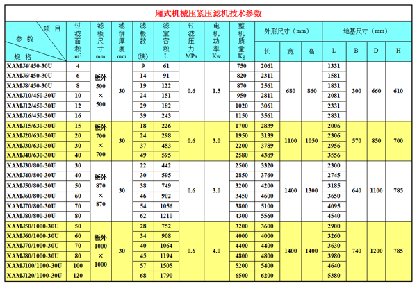 以下為廂式機(jī)械壓緊壓濾機(jī)技術(shù)參數(shù)